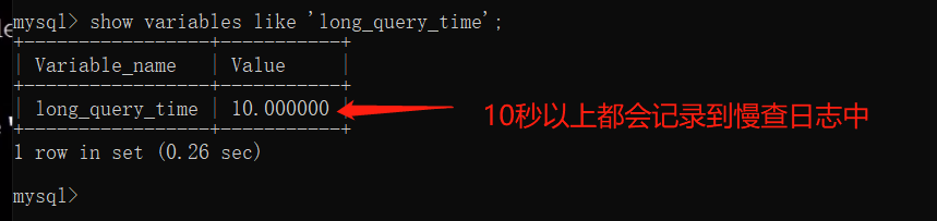 4、查询多长时间的sql会记录到慢查日志中:show variables like 'long_query_time';