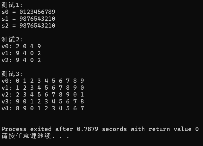 // 现代C++标准库、算法库体验 // 本例用到以下内容: // 1. 字符串string, 动态数组容器类vector、迭代器 // 2. 算法库:反转元素次序、旋转元素 // 3. 函数模板、const引用作为形参 #include <iostream> #include <string> #include <vector> #include <algorithm> using namespace std; // 声明 // 模板函数声明 template<typename T> void output(const T &c); // 普通函数声明 void test1(); void test2(); void test3(); int main() { cout << "测试1: \n"; test1(); cout << "\n测试2: \n"; test2(); cout << "\n测试3: \n"; test3(); } // 函数实现 // 输出容器对象c中的元素 template <typename T> void output(const T &c) { for(auto &i: c) cout << i << " "; cout << endl; } // 测试1 // 组合使用算法库、迭代器、string反转字符串 void test1() { string s0{"0123456789"}; cout << "s0 = " << s0 << endl; string s1{s0}; reverse(s1.begin(), s1.end()); // 反转指定迭代器区间的元素 cout << "s1 = " << s1 << endl; string s2{s0}; reverse_copy(s0.begin(), s0.end(), s2.begin()); // 将指定迭代区间的元素拷贝到指定迭代器开始的目标区间,并且在复制过程中反转次序 cout << "s2 = " << s2 << endl; } // 测试2 // 组合使用算法库、迭代器、vector反转动态数组对象vector内数据 void test2() { vector<int> v0{2, 0, 4, 9}; cout << "v0: "; output(v0); vector<int> v1{v0}; reverse(v1.begin(), v1.end()); cout << "v1: "; output(v1); vector<int> v2{v0}; reverse_copy(v0.begin(), v0.end(), v2.begin()); cout << "v2: "; output(v2); } // 测试3 // 组合使用算法库、迭代器、vector实现元素旋转移位 void test3() { vector<int> v0{0, 1, 2, 3, 4, 5, 6, 7, 8, 9}; cout << "v0: "; output(v0); vector<int> v1{v0}; rotate(v1.begin(), v1.begin()+1, v1.end()); // 旋转指定迭代器区间[v1.begin(), v1.end())之间的数据项,旋转后从迭代器v1.begin()+1位置的数据项开始 cout << "v1: "; output(v1); vector<int> v2{v0}; rotate(v2.begin(), v2.begin()+2, v2.end()); cout << "v2: "; output(v2); vector<int> v3{v0}; rotate(v3.begin(), v3.end()-1, v3.end()); cout << "v3: "; output(v3); vector<int> v4{v0}; rotate(v4.begin(), v4.end()-2, v4.end()); cout << "v4: "; output(v4); }