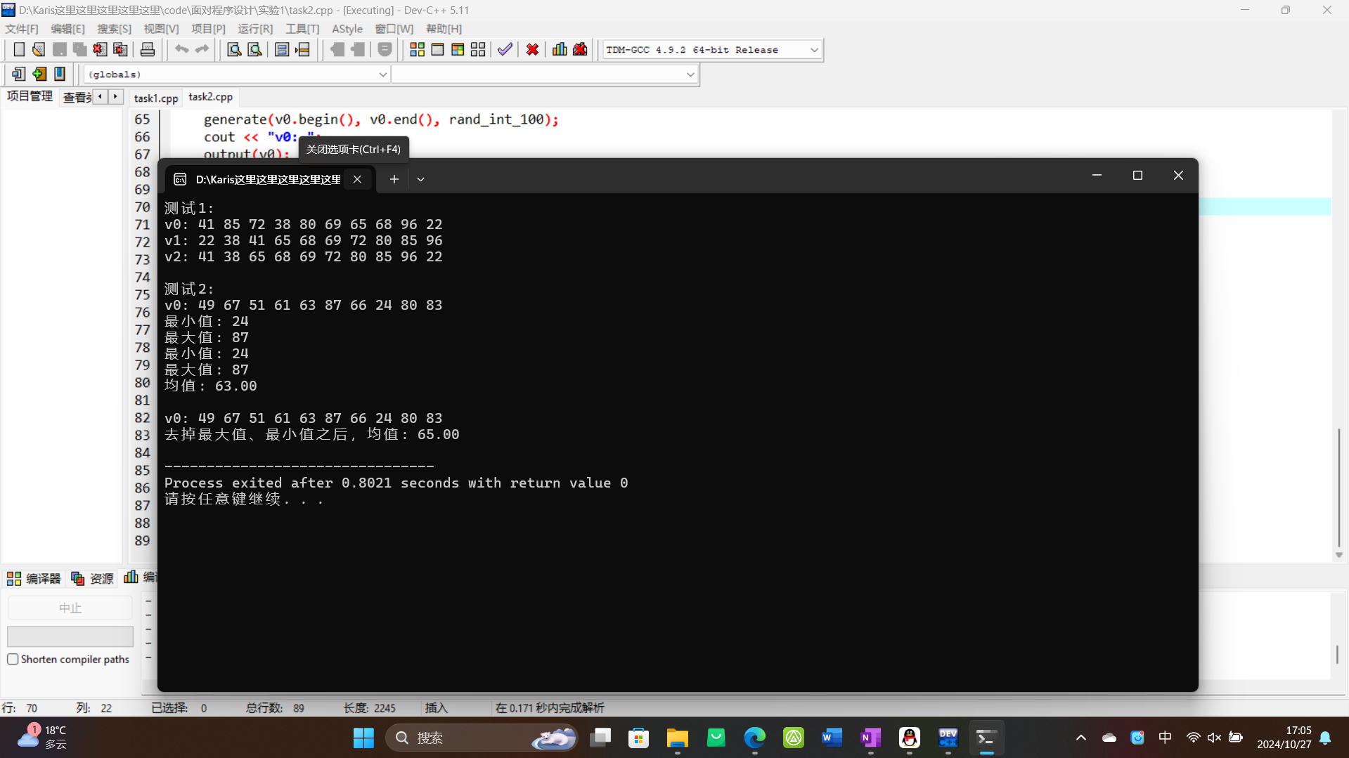 #include <iostream> #include <vector> #include <string> #include <algorithm> #include <numeric> #include <iomanip> using namespace std; // 函数声明 // 模板函数声明 template<typename T> void output(const T &c); // 普通函数声明 int rand_int_100(); void test1(); void test2(); int main() { cout << "测试1: \n"; test1(); cout << "\n测试2: \n"; test2(); } // 函数实现 // 输出容器对象c中的元素 template <typename T> void output(const T &c) { for(auto &i: c) cout << i << " "; cout << endl; } // 返回[0, 100]区间内的一个随机整数 int rand_int_100() { return rand() % 101; } // 测试1 // 对容器类对象指定迭代器区间进行赋值、排序 void test1() { vector<int> v0(10); // 创建一个动态数组对象v0, 对象大小为10 generate(v0.begin(), v0.end(), rand_int_100); // 产生[0, 100]之间的随机整数赋值给指定迭代器区间[v0.begin(), v0.end())内的每个数据项 cout << "v0: "; output(v0); vector<int> v1{v0}; sort(v1.begin(), v1.end()); // 对指定迭代器区间[v1.begin(), v1.end())内数据项进行升序排序 cout << "v1: "; output(v1); vector<int> v2{v0}; sort(v2.begin()+1, v2.end()-1); // 对指定迭代器区间[v1.begin()+1, v1.end()-1)内数据项进行升序排序 cout << "v2: "; output(v2); } // 测试2 // 对容器类对象指定迭代器区间进行赋值、计算最大值/最小值/均值 void test2() { vector<int> v0(10); generate(v0.begin(), v0.end(), rand_int_100); cout << "v0: "; output(v0); auto iter1 = min_element(v0.begin(), v0.end()); cout << "最小值: " << *iter1 << endl; auto iter2 = max_element(v0.begin(), v0.end()); cout << "最大值: " << *iter2 << endl; auto ans = minmax_element(v0.begin(), v0.end()); cout << "最小值: " << *(ans.first) << endl; cout << "最大值: " << *(ans.second) << endl; double avg1 = accumulate(v0.begin(), v0.end(), 0)/v0.size(); cout << "均值: " << fixed << setprecision(2) << avg1 << endl; cout << endl; vector<int> v1{v0}; cout << "v0: "; output(v0); sort(v1.begin(), v1.end()); double avg2 = accumulate(v1.begin()+1, v1.end()-1, 0)/(v1.size()-2); cout << "去掉最大值、最小值之后,均值: " << avg2 << endl; }