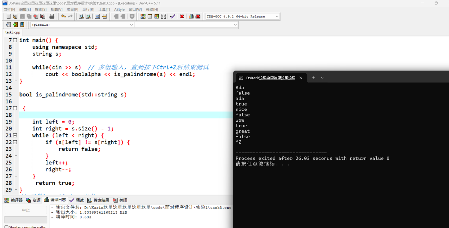 #include <iostream> #include <string> #include <algorithm> bool is_palindrome(std::string s); int main() { using namespace std; string s; while(cin >> s) // 多组输入,直到按下Ctrl+Z后结束测试 //使用 while (cin >> s) 读取多组输入,直到按下 Ctrl+Z(在Windows上)或 Ctrl+D(在Unix/Linux上)结束输入。 cout << boolalpha << is_palindrome(s) << endl;//boolalpha 用于以布尔值形式输出 true 或 false。 } bool is_palindrome(std::string s) { // 转换为小写并去除非字母数字字符(可选,根据需求) // 如果不需要,可以删除以下两行 std::transform(s.begin(), s.end(), s.begin(), ::tolower); s.erase(std::remove_if(s.begin(), s.end(), [](unsigned char c){ return !std::isalnum(static_cast<unsigned char>(c)); }), s.end()); int left = 0; int right = s.size() - 1; while (left < right) { if (s[left] != s[right]) { return false; } left++; right--; } return true; } // 函数is_palindrom定义 // 待补足 // ×××