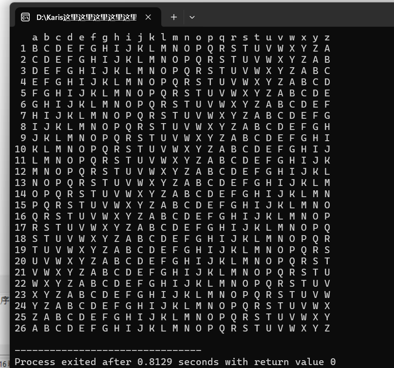 #include<iostream> #include<iomanip> using namespace std; int main() { int count=1; int i,j; cout<<" "; for(i=97;i<97+26;i++) { cout<<setw(2)<<char(i); } cout<<endl; for(i=1;i<=26;i++) { cout<<setw(2)<<i; for(j=i+1;j<=26;j++) { cout<<setw(2)<<char(j+64); } for(j=1;j<=i;j++) { cout<<setw(2)<<char(j+64); } cout<<endl; } return 0; }