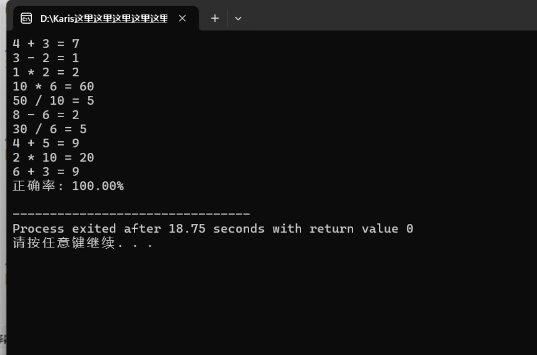 #include <iostream> #include <cstdlib> #include <ctime> #include <iomanip> using namespace std; // 生成随机数,范围在[min, max]之间 int randomInRange(int min, int max) { return rand() % (max - min + 1) + min; } // 生成除法题目时,确保能整除 pair<int, int> generateDivisiblePair() { int divisor = randomInRange(1, 10); int dividend = divisor * randomInRange(1, 10); // 确保能整除 return {dividend, divisor}; } // 生成减法题目时,确保第一个操作数大于第二个操作数 pair<int, int> generateSubtractPair() { int minuend = randomInRange(2, 10); // 至少为2以确保可以找到一个较小的减数 int subtrahend = randomInRange(1, minuend - 1); // 减数小于被减数 return {minuend, subtrahend}; } // 生成题目并评测用户答案 double generateAndEvaluateQuestions() { srand(static_cast<unsigned>(time(0))); // 设置随机种子为当前时间 int correctAnswers = 0; for (int i = 0; i < 10; ++i) { int operation = randomInRange(0, 3); // 0: 加, 1: 减, 2: 乘, 3: 除 pair<int, int> operands; switch (operation) { case 0: // 加法 operands = {randomInRange(1, 10), randomInRange(1, 10)}; cout << operands.first << " + " << operands.second << " = "; break; case 1: // 减法 operands = generateSubtractPair(); cout << operands.first << " - " << operands.second << " = "; break; case 2: // 乘法 operands = {randomInRange(1, 10), randomInRange(1, 10)}; cout << operands.first << " * " << operands.second << " = "; break; case 3: // 除法 operands = generateDivisiblePair(); cout << operands.first << " / " << operands.second << " = "; break; } int userAnswer; cin >> userAnswer; int correctAnswer; switch (operation) { case 0: correctAnswer = operands.first + operands.second; break; case 1: correctAnswer = operands.first - operands.second; break; case 2: correctAnswer = operands.first * operands.second; break; case 3: correctAnswer = operands.first / operands.second; break; } if (userAnswer == correctAnswer) { ++correctAnswers; } } double accuracy = static_cast<double>(correctAnswers) / 10 * 100; cout << fixed << setprecision(2) << "正确率: " << accuracy << "%" << endl; return accuracy; } int main() { generateAndEvaluateQuestions(); return 0; }