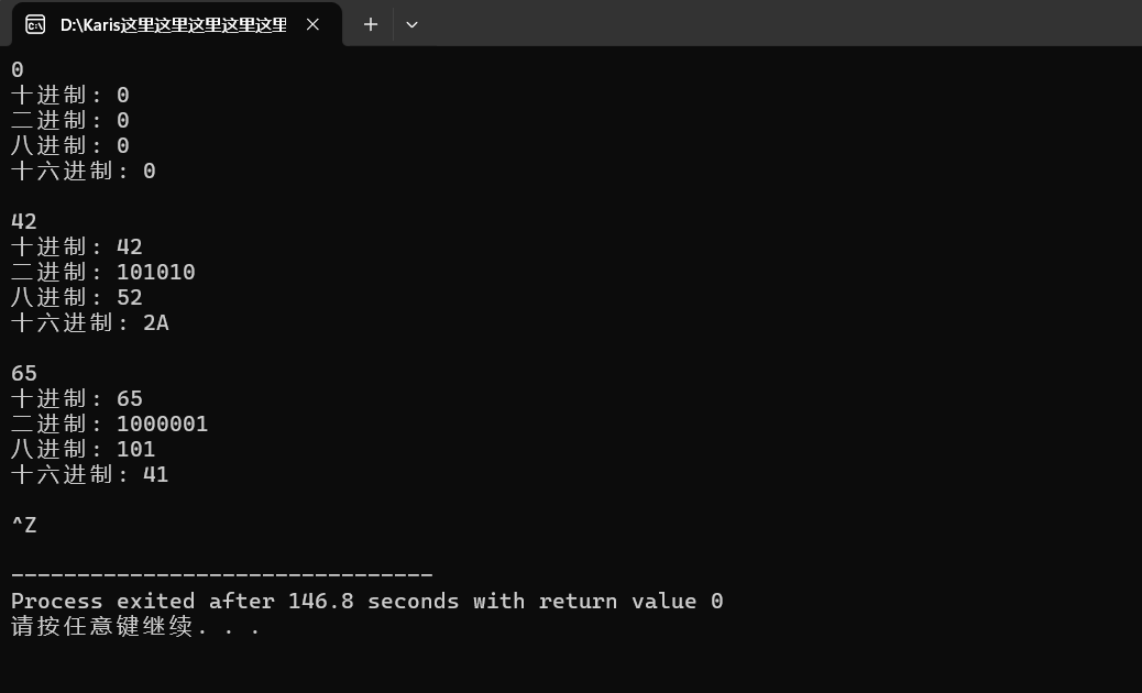 #include <iostream> #include <string> #include <algorithm> std::string dec2n(int x, int n = 2) { if (n < 2 || n > 36) { std::cout<<"wrong"<<endl; } const std::string digits = "0123456789ABCDEFGHIJKLMNOPQRSTUVWXYZ"; std::string result; // Handle zero explicitly, to avoid empty result if (x == 0) { return "0"; } // Convert to the desired base bool isNegative = x < 0; if (isNegative) { x = -x; } while (x > 0) { result += digits[x % n]; x /= n; } if (isNegative) { result += "-"; } // Reverse the result since we built it from least significant digit to most std::reverse(result.begin(), result.end()); return result; } int main() { using namespace std; int x; while(cin >> x) { cout << "十进制: " << x << endl; cout << "二进制: " << dec2n(x) << endl; cout << "八进制: " << dec2n(x, 8) << endl; cout << "十六进制: " << dec2n(x, 16) << endl << endl; } } // 函数dec2n定义 // 待补足 // ×××