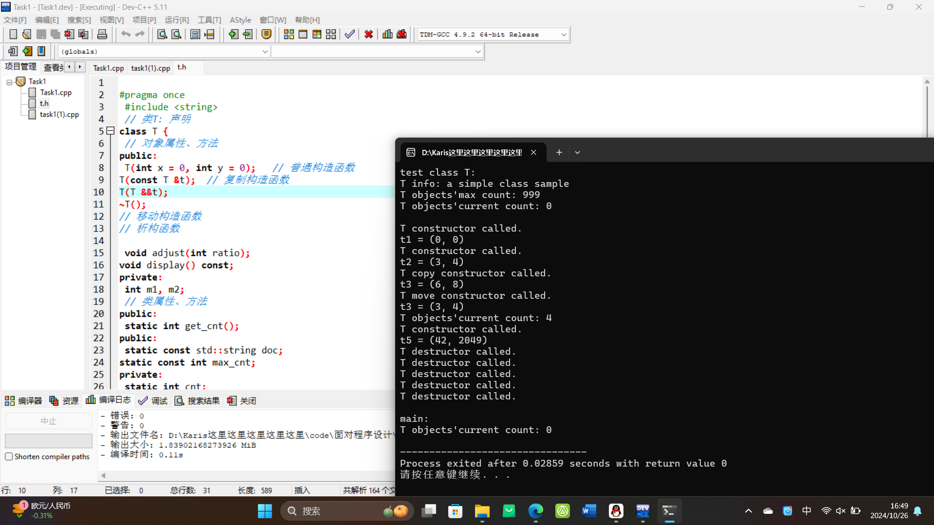#pragma once #include <string> // 类T: 声明 class T { // 对象属性、方法 public: T(int x = 0, int y = 0); // 普通构造函数 T(const T &t); // 复制构造函数 T(T &&t); ~T(); // 移动构造函数 // 析构函数 void adjust(int ratio); void display() const; private: int m1, m2; // 类属性、方法 public: static int get_cnt(); public: static const std::string doc; static const int max_cnt; private: static int cnt; // 类T友元函数声明 friend void func(); }; // 普通函数声明 void func(); const std::string T::doc{"a simple class sample"}; const int T::max_cnt = 999; int T::cnt = 0; // 类T: 实现 // 普通函数实现 #include "t.h" #include <iostream> #include <string> using std::cout; using std::endl; using std::string; // static成员数据类外初始化 // 对象方法 T::T(int x, int y): m1{x}, m2{y} { ++cnt; cout << "T constructor called.\n"; } T::T(const T &t): m1{t.m1}, m2{t.m2} { ++cnt; cout << "T copy constructor called.\n"; } T::T(T &&t): m1{t.m1}, m2{t.m2} { ++cnt; cout << "T move constructor called.\n"; } T::~T() { --cnt; cout << "T destructor called.\n"; } void T::adjust(int ratio) { m1 *= ratio; m2 *= ratio; } void T::display() const { cout << "(" << m1 << ", " << m2 << ")" ; } // 类方法 int T::get_cnt() { return cnt; } // 友元 void func() { T t5(42); t5.m2 = 2049; cout << "t5 = "; t5.display(); cout << endl; } #include "t.h" #include <iostream> using std::cout; using std::endl; void test(); int main() { test(); cout << "\nmain: \n"; cout << "T objects'current count: " << T::get_cnt() << endl; } void test() { cout << "test class T: \n"; cout << "T info: " << T::doc << endl; cout << "T objects'max count: " << T::max_cnt << endl; cout << "T objects'current count: " << T::get_cnt() << endl << endl; T t1; cout << "t1 = "; t1.display(); cout << endl; T t2(3, 4); cout << "t2 = "; t2.display(); cout << endl; T t3(t2); t3.adjust(2); cout << "t3 = "; t3.display(); cout << endl; T t4(std::move(t2)); cout << "t3 = "; t4.display(); cout << endl; cout << "T objects'current count: " << T::get_cnt() << endl; func(); }