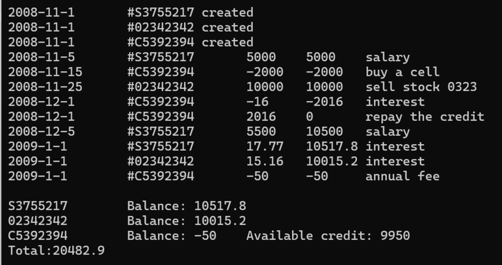 #include "account.h" #include <iostream> using namespace std; int main() { Date date(2008, 11, 1); SavingsAccount sa1(date, "S3755217", 0.015); SavingsAccount sa2(date, "02342342", 0.015); CreditAccount ca(date, "C5392394", 10000, 0.0005, 50); sa1.deposit(Date(2008, 11, 5), 5000, "salary"); ca.withdraw(Date(2008, 11, 15), 2000, "buy a cell"); sa2.deposit(Date(2008, 11, 25), 10000, "sell stock 0323"); ca.settle(Date(2008, 12, 1)); ca.deposit(Date(2008, 12, 1), 2016, "repay the credit"); sa1.deposit(Date(2008, 12, 5), 5500, "salary"); sa1.settle(Date(2009, 1, 1)); sa2.settle(Date(2009, 1, 1)); ca.settle(Date(2009, 1, 1)); cout << endl; sa1.show(); cout << endl; sa2.show(); cout << endl; ca.show(); cout << endl; cout << "Total:" << Account::getTotal() << endl; return 0; }