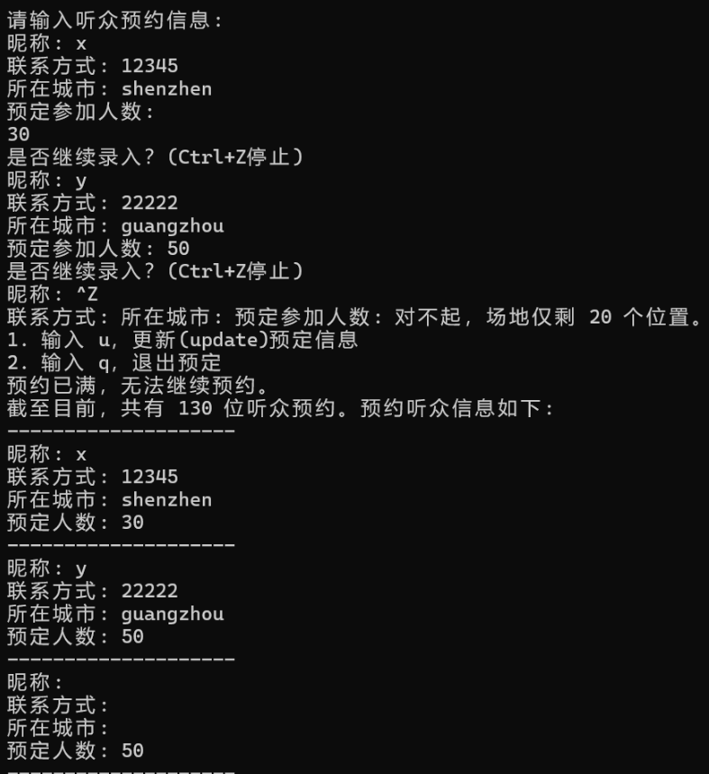 #include "info.hpp" #include <iostream> #include <vector> #include <string> using std::cin; using std::cout; using std::endl; using std::string; using std::vector; int main() { const int capacity = 100; // livehouse最大容量 vector<Info> audience_lst; // 存储听众预约信息 int total = 0; // 当前总预约人数 cout << "请输入听众预约信息:" << endl; while (true) { string nickname, contact, city; int n; cout << "昵称: "; cin >> nickname; cout << "联系方式: "; cin >> contact; cout << "所在城市: "; cin >> city; cout << "预定参加人数: "; cin >> n; // 检查剩余容量 if (total + n > capacity) { cout << "对不起,场地仅剩 " << (capacity - total) << " 个位置。" << endl; cout << "1. 输入 u,更新(update)预定信息" << endl; cout << "2. 输入 q,退出预定" << endl; char choice; cin >> choice; if (choice == 'q') { continue; // 放弃当前用户 } else if (choice == 'u') { cout << "请重新输入预定信息:" << endl; cout << "预定参加人数: "; cin >> n; if (n + total > capacity) { cout << "仍超过剩余容量,预约失败。" << endl; continue; } } } // 添加听众信息 audience_lst.emplace_back(nickname, contact, city, n); total += n; // 检查是否达到容量上限 if (total >= capacity) { cout << "预约已满,无法继续预约。" << endl; break; } // 停止录入(Ctrl+Z 或手动条件设计) cout << "是否继续录入?(Ctrl+Z停止)" << endl; if (cin.eof()) break; } // 输出听众预约信息 cout << "截至目前,共有 " << total << " 位听众预约。预约听众信息如下:" << endl; cout << "--------------------" << endl; for (const auto& audience : audience_lst) { audience.display(); } return 0; }