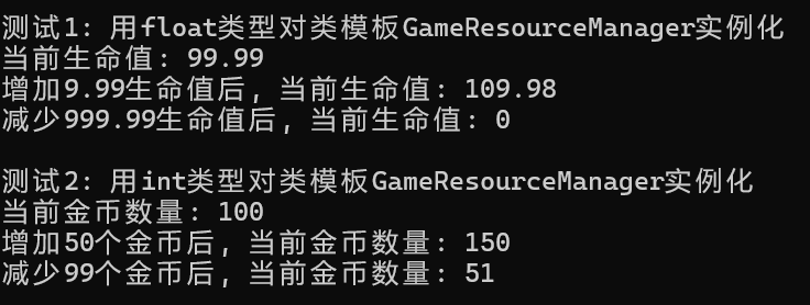 #include "grm.hpp" #include <iostream> using std::cout; using std::endl; void test1() { GameResourceManager<float> HP_manager(99.99); cout << "当前生命值: " << HP_manager.get() << endl; HP_manager.update(9.99); cout << "增加9.99生命值后, 当前生命值: " << HP_manager.get() << endl; HP_manager.update(-999.99); cout <<"减少999.99生命值后, 当前生命值: " << HP_manager.get() << endl; } void test2() { GameResourceManager<int> Gold_manager(100); cout << "当前金币数量: " << Gold_manager.get() << endl; Gold_manager.update(50); cout << "增加50个金币后, 当前金币数量: " << Gold_manager.get() << endl; Gold_manager.update(-99); cout <<"减少99个金币后, 当前金币数量: " << Gold_manager.get() << endl; } int main() { cout << "测试1: 用float类型对类模板GameResourceManager实例化" << endl; test1(); cout << endl; cout << "测试2: 用int类型对类模板GameResourceManager实例化" << endl; test2(); }