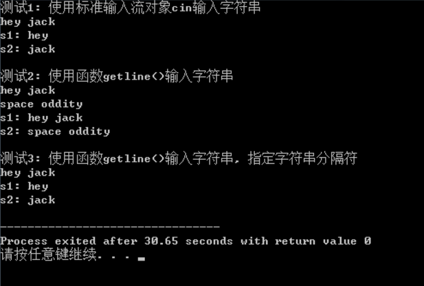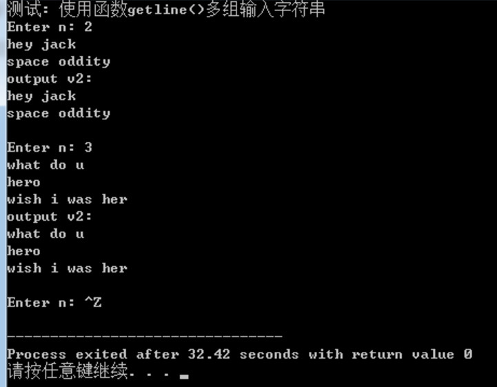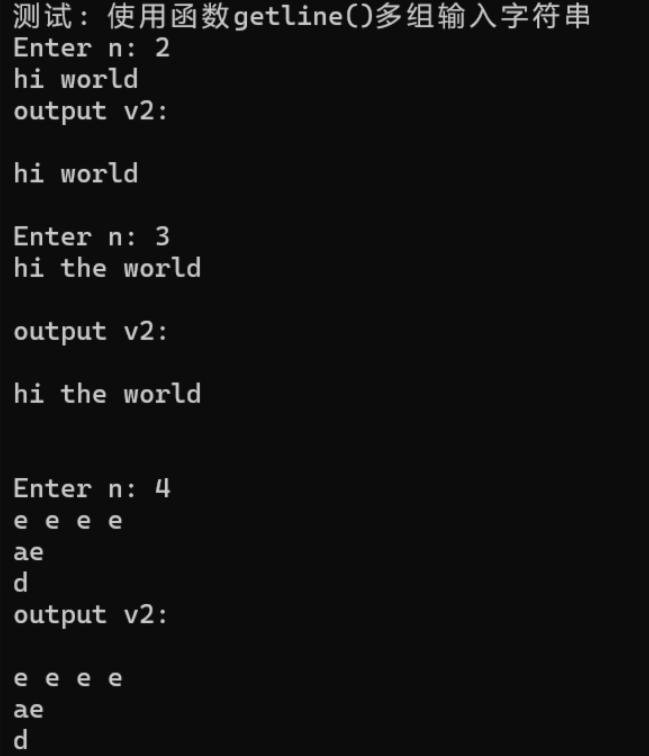 #include <iostream> #include <string> #include <vector> #include <limits> using namespace std; void output(const vector<string> &v) { for(auto &s: v) cout << s << endl; } void test() { int n; while(cout << "Enter n: ", cin >> n) { cin.ignore(numeric_limits<streamsize>::max(), '\n'); vector<string> v2; for(int i = 0; i < n; ++i) { string s; getline(cin, s); v2.push_back(s); } cout << "output v2: " << endl; output(v2); cout << endl; } } int main() { cout << "测试: 使用函数getline()多组输入字符串" << endl; test(); }