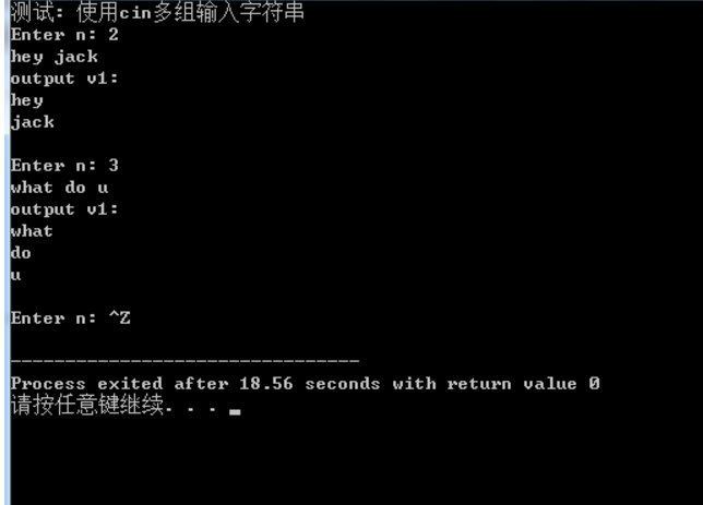 #include <iostream> #include <string> #include <vector> #include <limits> using namespace std; void output(const vector<string> &v) { for(auto &s: v) cout << s << endl; } void test() { int n; while(cout << "Enter n: ", cin >> n) { vector<string> v1; for(int i = 0; i < n; ++i) { string s; cin >> s; v1.push_back(s); } cout << "output v1: " << endl; output(v1); cout << endl; } } int main() { cout << "测试: 使用cin多组输入字符串" << endl; test(); }