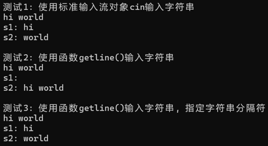 #include <iostream> #include <string> #include <limits> using namespace std; void test1() { string s1, s2; cin >> s1 >> s2; // cin: 从输入流读取字符串, 碰到空白符(空格/回车/Tab)即结束 cout << "s1: " << s1 << endl; cout << "s2: " << s2 << endl; } void test2() { string s1, s2; getline(cin, s1); // getline(): 从输入流中提取字符串,直到遇到换行符 getline(cin, s2); cout << "s1: " << s1 << endl; cout << "s2: " << s2 << endl; } void test3() { string s1, s2; getline(cin, s1, ' '); //从输入流中提取字符串,直到遇到指定分隔符 getline(cin, s2); cout << "s1: " << s1 << endl; cout << "s2: " << s2 << endl; } int main() { cout << "测试1: 使用标准输入流对象cin输入字符串" << endl; test1(); cout << endl; cin.ignore(numeric_limits<streamsize>::max(), '\n'); cout << "测试2: 使用函数getline()输入字符串" << endl; test2(); cout << endl; cout << "测试3: 使用函数getline()输入字符串, 指定字符串分隔符" << endl; test3(); }