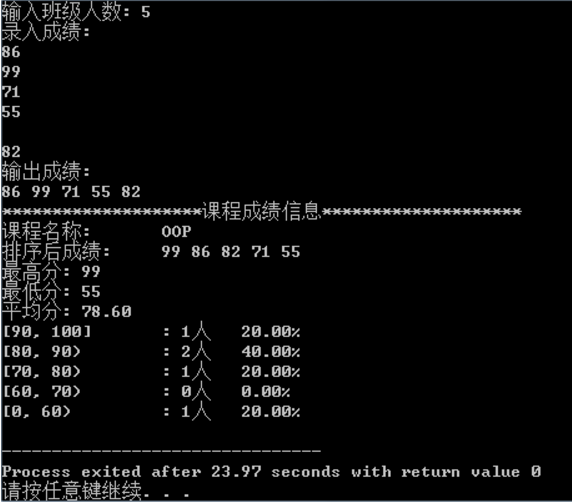 #include <iostream> #include <vector> #include <string> #include <algorithm> #include <numeric> #include <iomanip> using std::vector; using std::string; using std::cin; using std::cout; using std::endl; class GradeCalc: public vector<int> { public: GradeCalc(const string &cname, int size); void input(); // 录入成绩 void output() const; // 输出成绩 void sort(bool ascending = false); // 排序 (默认降序) int min() const; // 返回最低分 int max() const; // 返回最高分 float average() const; // 返回平均分 void info(); // 输出课程成绩信息 private: void compute(); // 成绩统计 private: string course_name; // 课程名 int n; // 课程人数 vector<int> counts = vector<int>(5, 0); // 保存各分数段人数([0, 60), [60, 70), [70, 80), [80, 90), [90, 100] vector<double> rates = vector<double>(5, 0); // 保存各分数段比例 }; GradeCalc::GradeCalc(const string &cname, int size): course_name{cname}, n{size} {} void GradeCalc::input() { int grade; for(int i = 0; i < n; ++i) { cin >> grade; this->push_back(grade); } } void GradeCalc::output() const { for(auto ptr = this->begin(); ptr != this->end(); ++ptr) cout << *ptr << " "; cout << endl; } void GradeCalc::sort(bool ascending) { if(ascending) std::sort(this->begin(), this->end()); else std::sort(this->begin(), this->end(), std::greater<int>()); } int GradeCalc::min() const { return *std::min_element(this->begin(), this->end()); } int GradeCalc::max() const { return *std::max_element(this->begin(), this->end()); } float GradeCalc::average() const { return std::accumulate(this->begin(), this->end(), 0) * 1.0 / n; } void GradeCalc::compute() { for(int grade: *this) { if(grade < 60) counts.at(0)++; else if(grade >= 60 && grade < 70) counts.at(1)++; else if(grade >= 70 && grade < 80) counts.at(2)++; else if(grade >= 80 && grade < 90) counts.at(3)++; else if(grade >= 90) counts.at(4)++; } for(int i = 0; i < rates.size(); ++i) rates.at(i) = counts.at(i) * 1.0 / n; } void GradeCalc::info() { cout << "课程名称:\t" << course_name << endl; cout << "排序后成绩: \t"; sort(); output(); cout << "最高分:\t" << max() << endl; cout << "最低分:\t" << min() << endl; cout << "平均分:\t" << std::fixed << std::setprecision(2) << average() << endl; compute(); // 统计各分数段人数、比例 vector<string> tmp{"[0, 60) ", "[60, 70)", "[70, 80)","[80, 90)", "[90, 100]"}; for(int i = tmp.size()-1; i >= 0; --i) cout << tmp[i] << "\t: " << counts[i] << "人\t" << std::fixed << std::setprecision(2) << rates[i]*100 << "%" << endl; }
