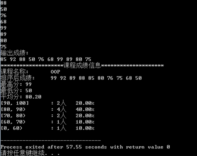 #include "GradeCalc.hpp" #include <iomanip> void test() { int n; cout << "输入班级人数: "; cin >> n; GradeCalc c1("OOP", n); cout << "录入成绩: " << endl;; c1.input(); cout << "输出成绩: " << endl; c1.output(); cout << string(20, '*') + "课程成绩信息" + string(20, '*') << endl; c1.info(); } int main() { test(); }