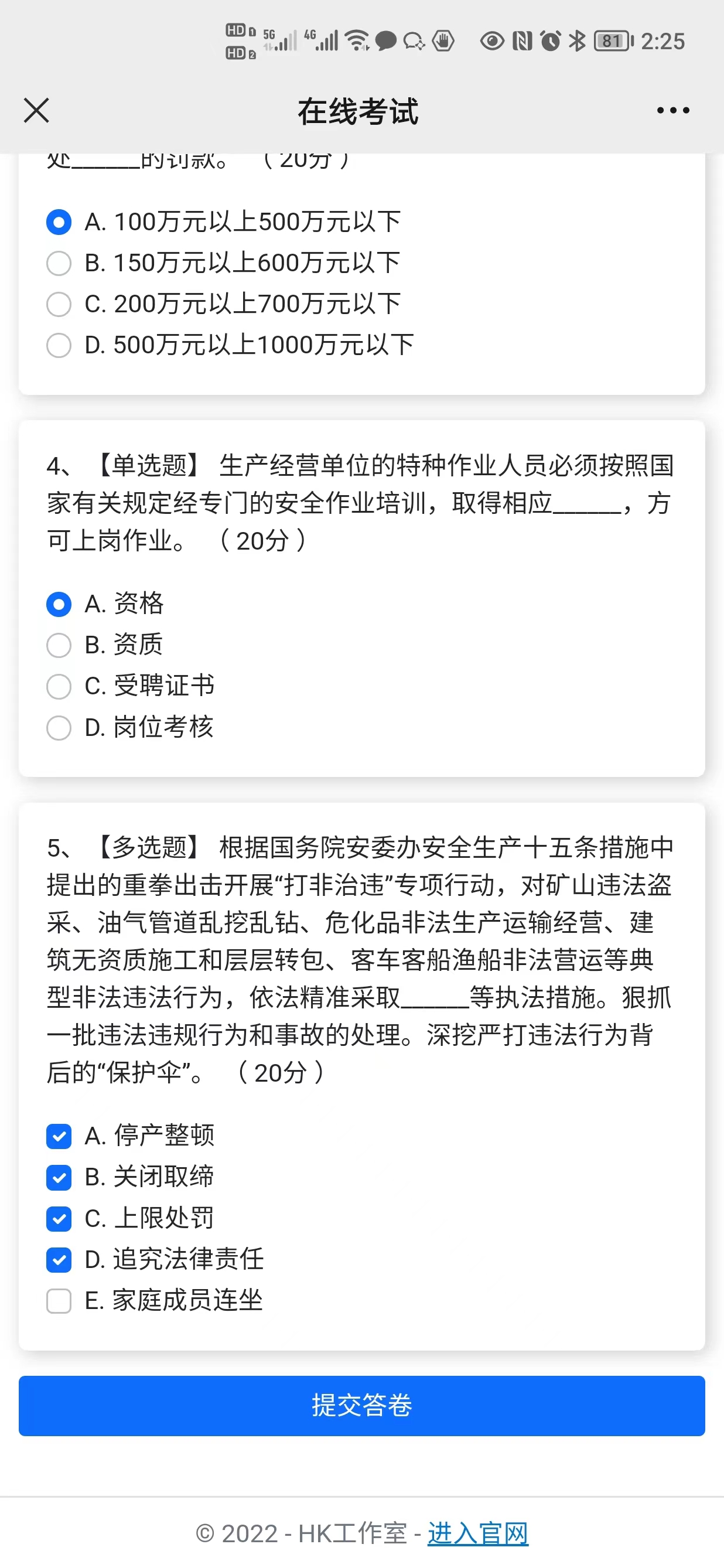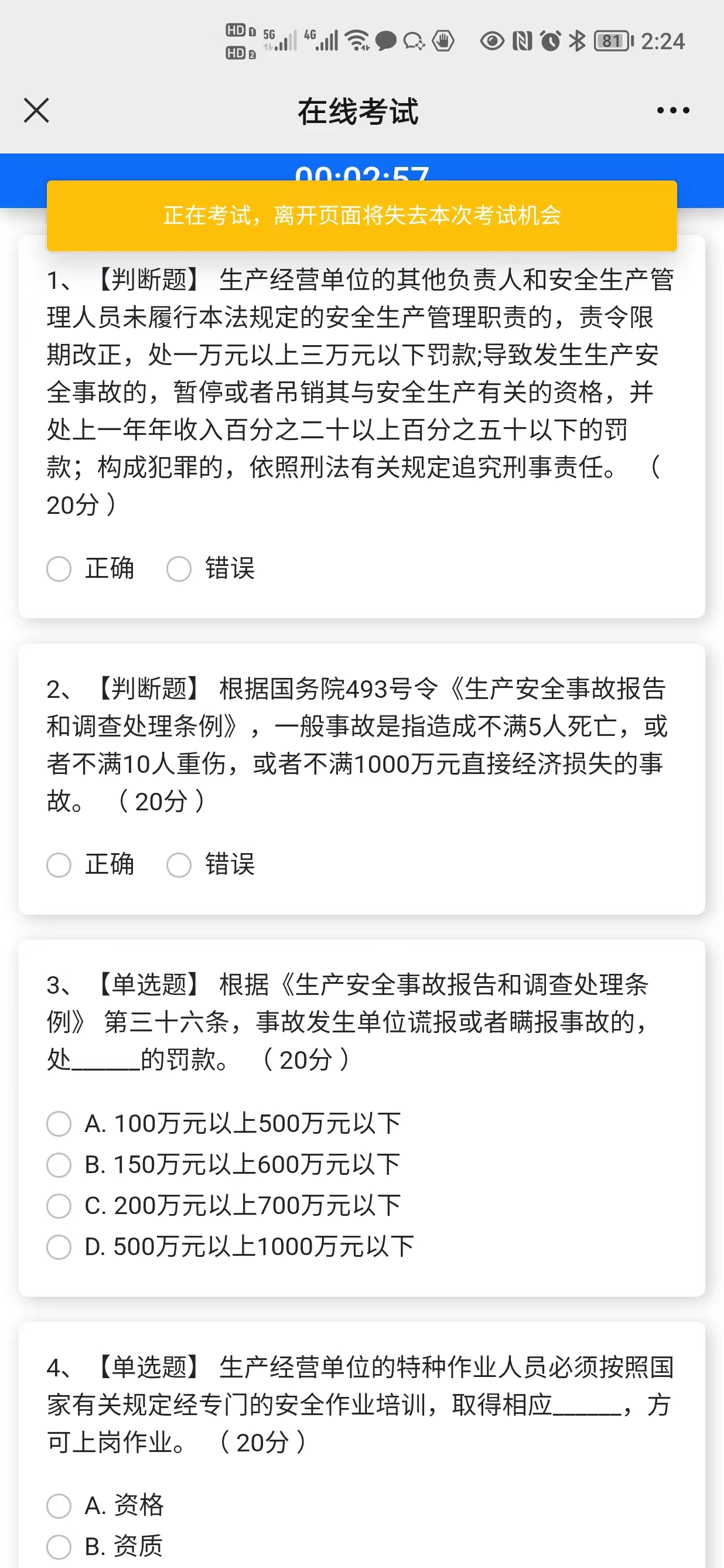 限时3分钟考试,答完考卷手动提交或者时间截止自动提交;