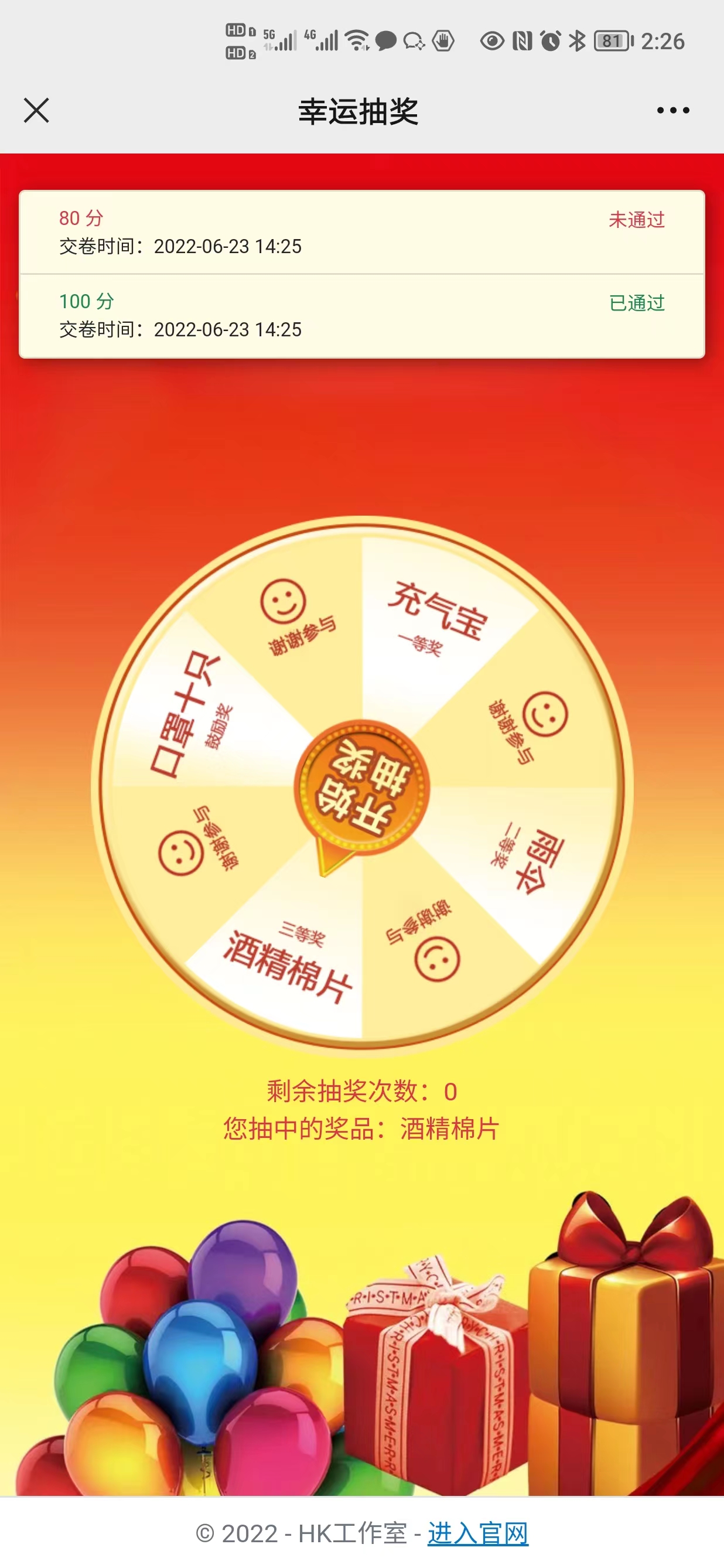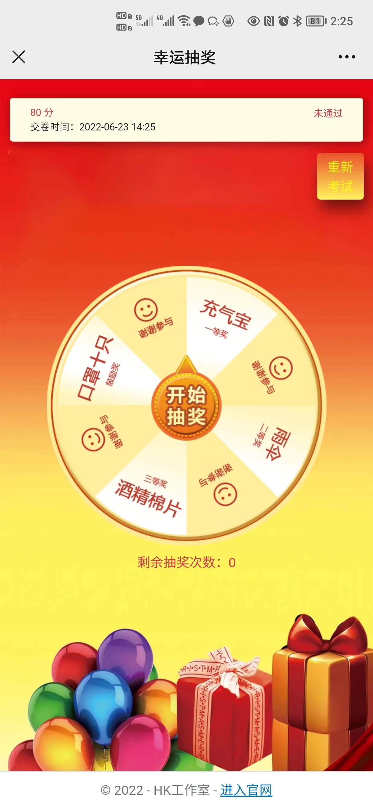 只有当答题结束并且通过考试才能获取一次抽奖机会;