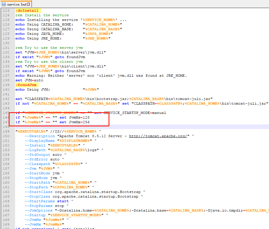 打开service.bat文件,找到如下两个参数--JvmMs(最小内存)、--JvmMx(最大内存) 修改为自己需要的大小,我们可以看到,图中,这两个参数的默认值,我们只需要修改默认值,保存,然后重新安装服务。