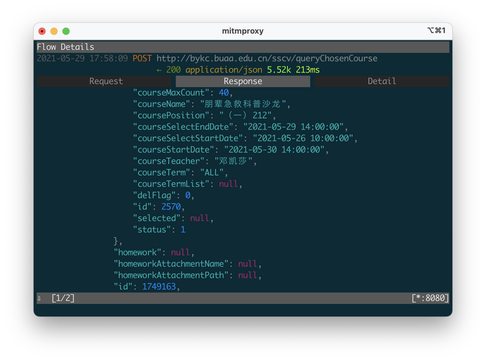 进入选课网站,点击已选课程,就可以看到这两个数据包了,其中我们要观察queryChosenCourse返回的数据,找到我们要退选的课程的id。当左边的>>指向目标,按回车就可以查看细节,该程序各个界面的指针的移动方式都可以选择使用vim键位,十分舒适。