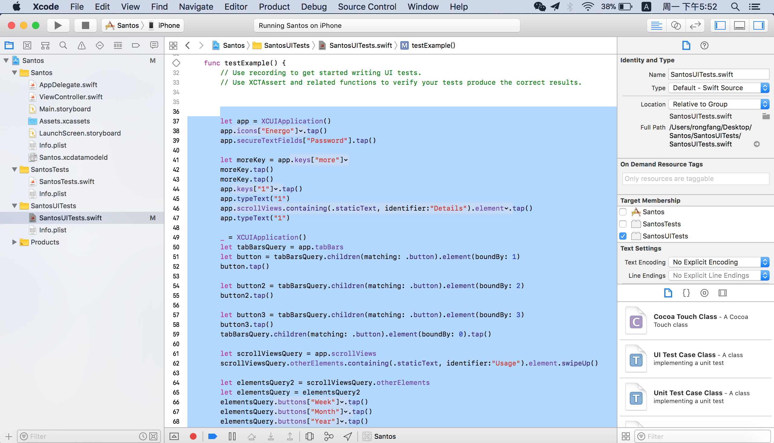 Step6. Go to Santos project > SantosUITests, 光标定位到function里面,点击录制