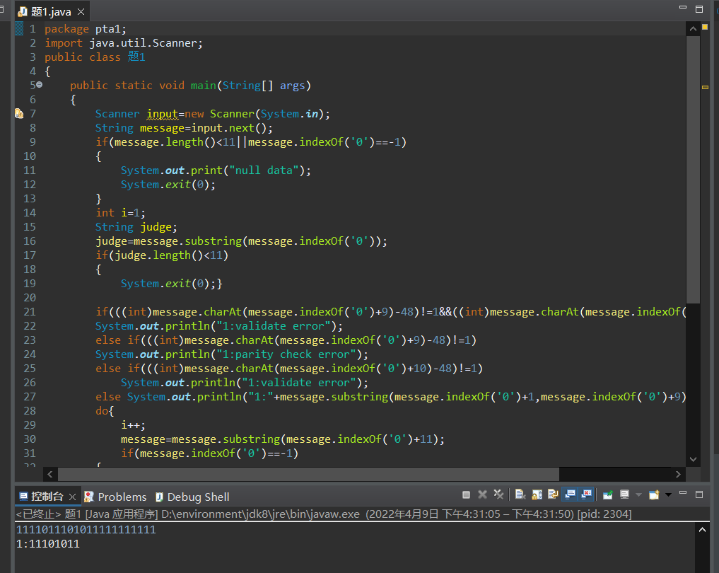 接收字符串,然后判断是否达到规定的最短长度,再依次判断奇偶性以及结束符,然后利用indexOf和charAt方法分割字符串,再输出。做完题目二后对分割字符串,判断字串内容有了更深刻的了解,利用indexOf和charAt方法可以较好的分割,判断字符串是否符合输入要求。