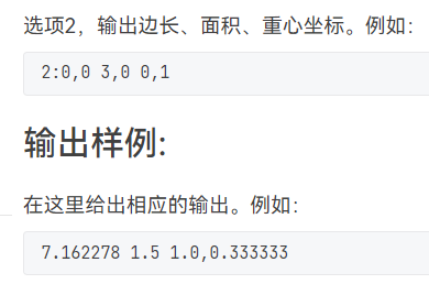 2:输入三个点坐标,输出周长、面积、重心坐标,三个参数之间以一个英文空格分隔,坐标之间以英文","分隔。