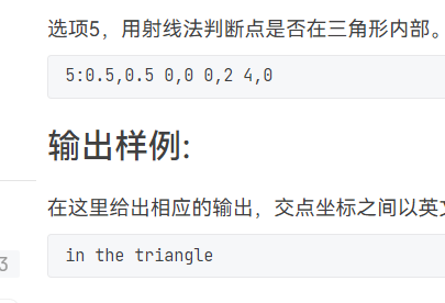 5:输入四个点坐标,输出第一个是否在后三个点所构成的三角形的内部(输出in the triangle/outof triangle)。