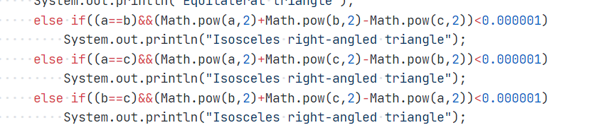 如果将判断条件改为0,则会出错,因为java计算浮点数无法精确,只能以这种形式判断三角形的形状。