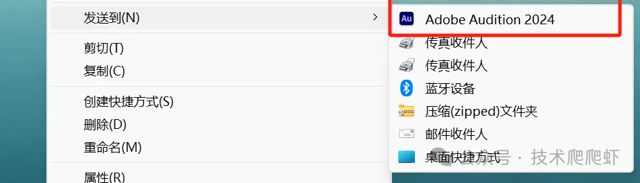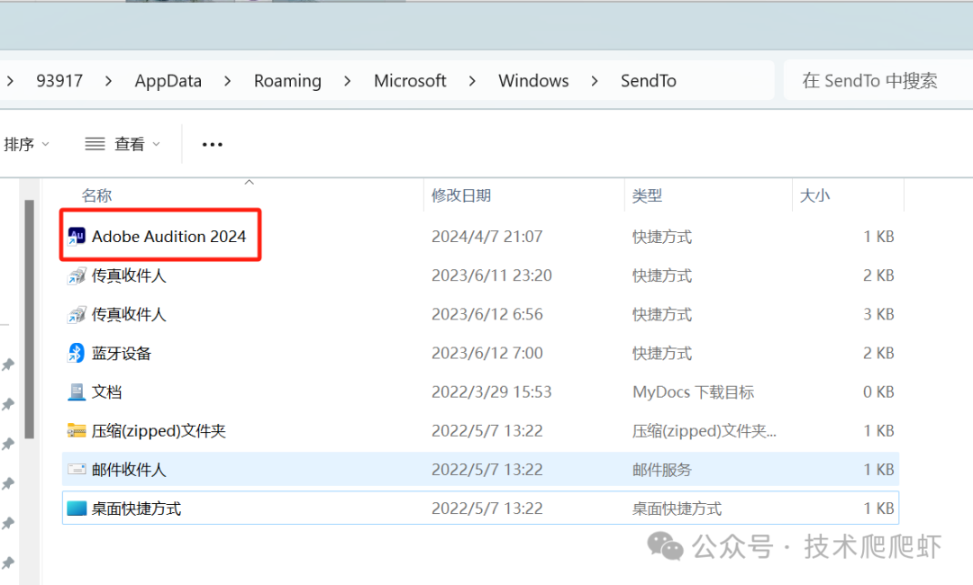 但是有时候不方便拖拽,我们可以使用sendto功能,先把Adobe Audition的快捷方式直接放到sendto文件夹
