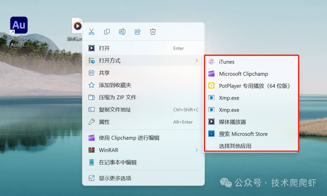打开windows文件管理器,输入shell:sendto ,这里打开了sendto文件夹。在win10中右键点击一个文件,win11中则是shift+右键 这里有一个发送到功能,sendto文件夹则是对应这个功能了。我们来看下他的实际用途,这里有一个音频文件,我想把它放到Adobe Audition 里面对它进行编辑,右键打开方式里根本就没有Adobe Audition! 如果再点击其他应用再一个个找就太费劲了。