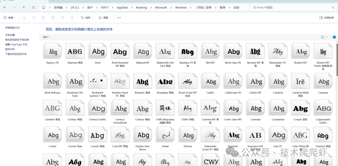 这里显示了所有电脑上安装过的字体,这些安装过的字体都可以在word, ppt等软件使用。我们可以双击一个字体对其预览,也可以直接右键删除。可以看到我电脑里装的字体都是开源免费的,这样可以避开字体版权流氓。爬爬虾有一个完整视频介绍过如何下载使用开源免费字体,感兴趣观众可以找来看看。
