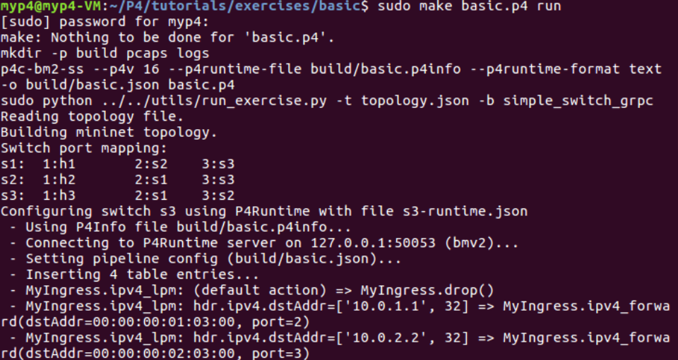 学习P4官方示例教程,链接:https://github.com/p4lang/tutorials,了解P4-16版本的基本语法、基于V1Model的P4代码结构,完成如下练习: