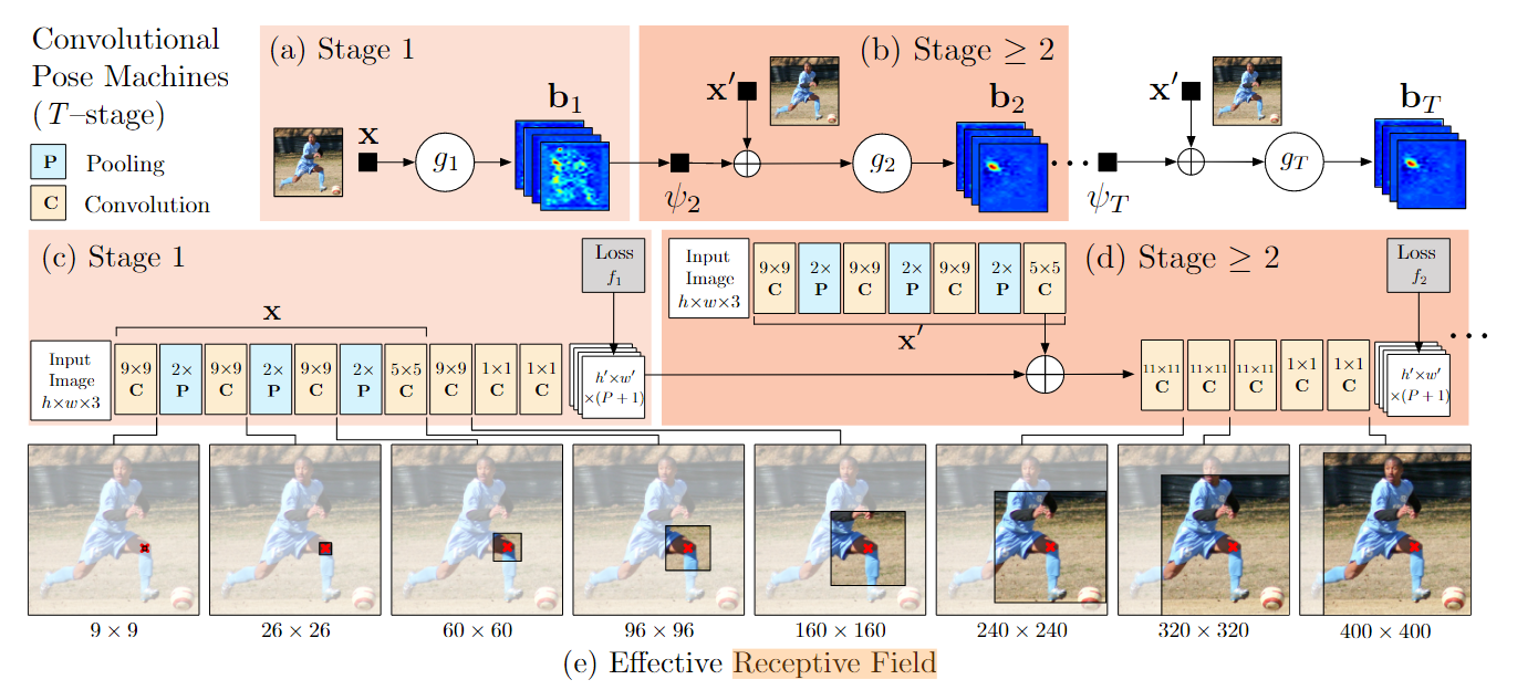 输入一个图片,然后输出n张n个关节的belief map(这个,我看图的感觉就是热力图呀),在stage1输出的过程中,其关节部分的感受野会不断的增大,也就是获取各个关节之间的联系(这一点后文中有提到随着感受野的增大,准确率也随之增加,到能完整包括一个人后再增加就趋于饱和了,符合目的。)至于stage2则是将阶段一的结果和原图一起作为输入,看图这里应该是加法,也就是增加维度,后续的阶段则是利用stage2中输入图片的特征,加上各个阶段的前一阶段的输出。