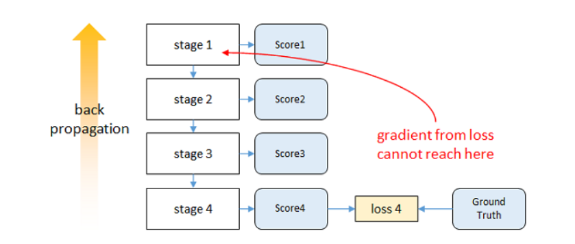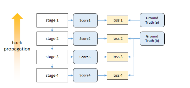 这篇论文还有一点就是监督了,就是反向传播的过程中,越靠近输入损失就越小,而采用中间监督,也就是每个阶段都计算损失,就可以避免这种问题。