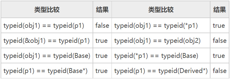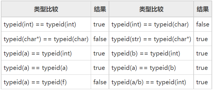 注:C++ 能获取到的类型信息非常有限,也没有统一的标准,如同“鸡肋”一般,大部分情况下我们只是使用重载过的“==”运算符来判断两个类型是否相同。
