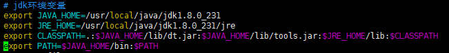 /usr/local/java/jdk1.8.0_221是我安装jdk的路径 export JAVA_HOME=/usr/local/java/jdk1.8.0_221 export JRE_HOME=/usr/local/java/jdk1.8.0_221/jre export CLASSPATH=.:$JAVA_HOME/lib/dt.jar:$JAVA_HOME/lib/tools.jar:$JRE_HOME/lib: $CLASSPATH export PATH=$JAVA_HOME/bin:$PATH