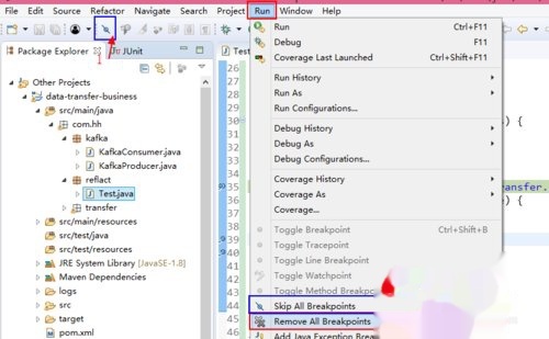 跳过或清除断点:下图所示的1和2为Skip All Breakpoints ,将所有的断点设置为跳过,所以断点上会有一个斜线,表示断点被跳过,线程不会在该断点处被挂起。点击Run-->Remove All Breakpoints清除所有的断点,在断点调试完可进行此操作。