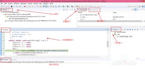 以debug方式运行java程序后,跳转到调试视图,其中最常用的窗口有:Debug窗口,变量Variables窗口,断点Breakpoints窗口,代码编辑窗口,输出Console窗口,大纲outline窗口。Debug窗口显示当前线程方法调用栈,及方法执行到第几行,Variables显示当前方法的局部变量,非静态的变量等,可以修改变量值,Breakpoints可用来新增和删除断点等,Console控制台用于查看打印的日志信息。