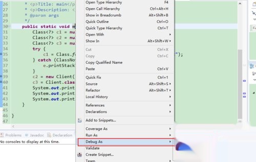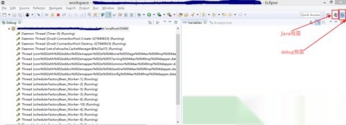 Debug调试完成后,需要切换回Java视图,下面介绍两种切换的方法。1是通过IDE右上角的两个按钮进行切换,如下图所示。2是点击菜单Window-->Perspective-->Open Perspective选择相应的视图。