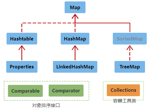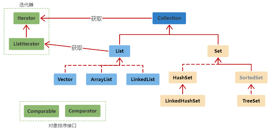 Collection接口继承树:实线是继承关系,虚线是实现关系