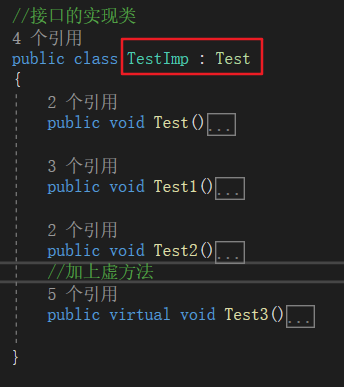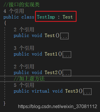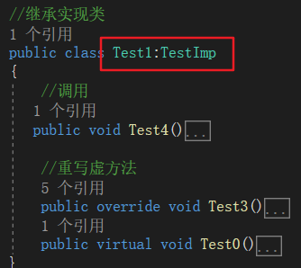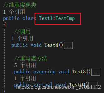 在C#中,接口和类的实现和继承的外在形式没有太大的差别,都是一个冒号“:”来解决的,如下图
