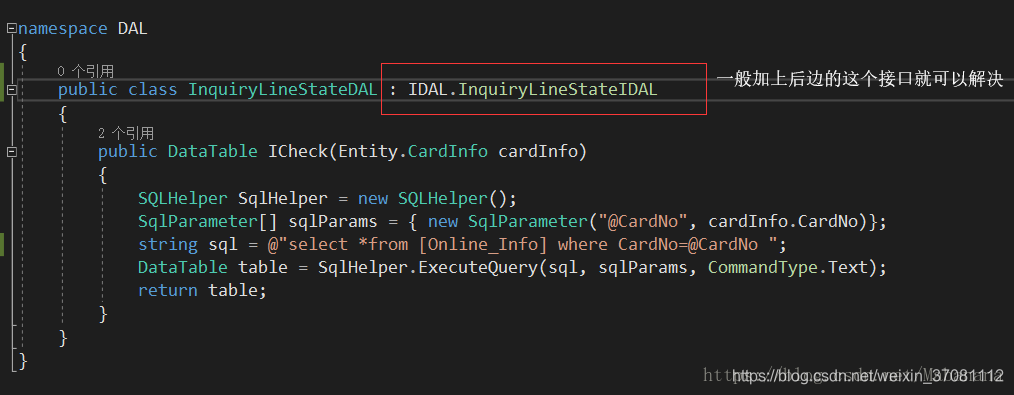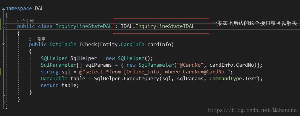 然后,首先看一下自己的DAL层是否有继承这个接口: