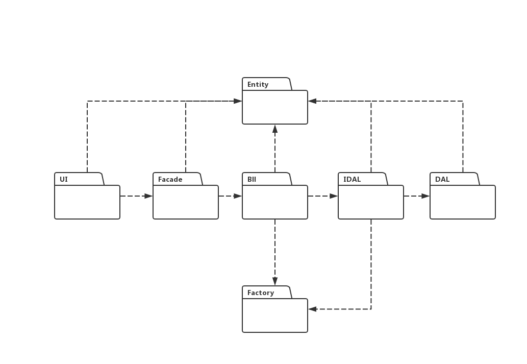 从这个包图上可以看见,增加了外观层,接口层,抽象工厂层,实体层,实体层可以看做是三层里的Model层,从结果上来看,它们的功能是相似的。