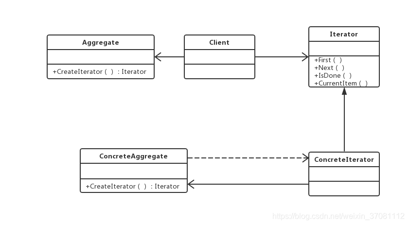 4、在迭代器模式中,增加新的聚合类和迭代器类都很方便,无须修改原有代码。