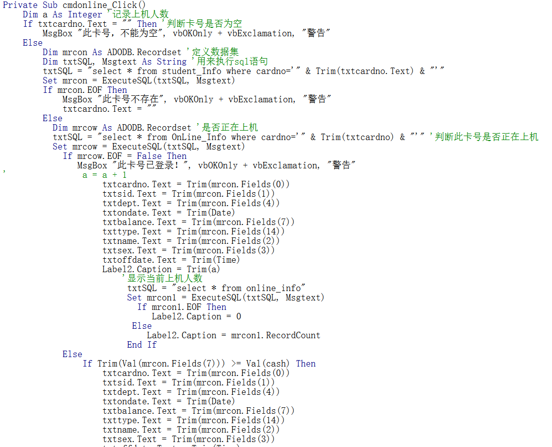在这次的机房收费系统中,有几个类型的代码使用频率非常高,基本上每一个窗体都出了,下面是代码展示