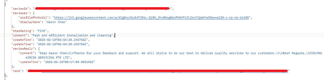 至此 Review API 需要的 accountId 和 locationId 就拿到了, 发送请求后会得到所有 reviews.