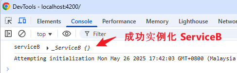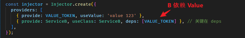 在创建 ServiceB 时,我们 "provide 提供" 了 ServiceB 所需要的依赖 ServiceA。