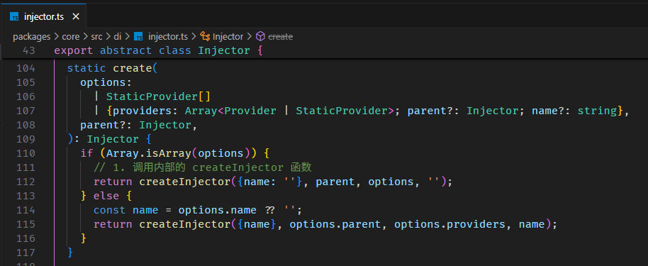 Injector.create 方法的源码在 injector.ts。