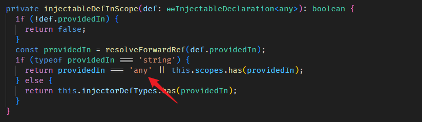 providedIn: 'any' 表示 in scope(注: 除了 any 其实还可以放其它值,比如 'root' 和 'platform',这个以后章节会教)