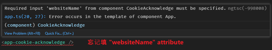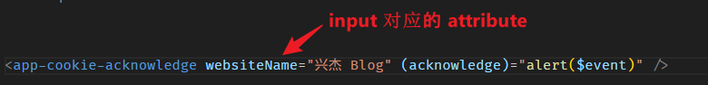 这表示 CookieAcknowledge 组件有一个 property "websiteName",相应地,它也会有一个 "websiteName" attribute。