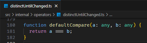而 KO 有一个判断,只有当 old value 和 new value 不相等的时候,subscription callback 才会触发。如果我们希望 RxJS 像 KO 那样,可以加一个 distinctUntilChanged operator,过滤掉相同值触发。