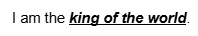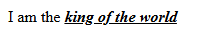 <!DOCTYPE html> <html lang="en"> <head> <meta charset="UTF-8"> <meta name="viewport" content="width=device-width, initial-scale=1.0"> <title>Document</title> </head> <body> <p>I am the <b><i><u>king of the world</u></i></b></p> </body> </html>