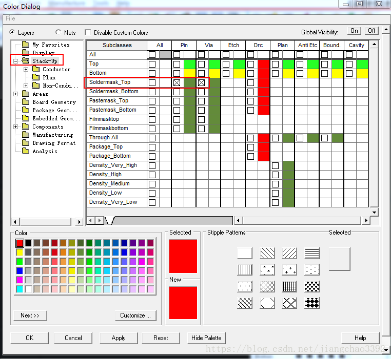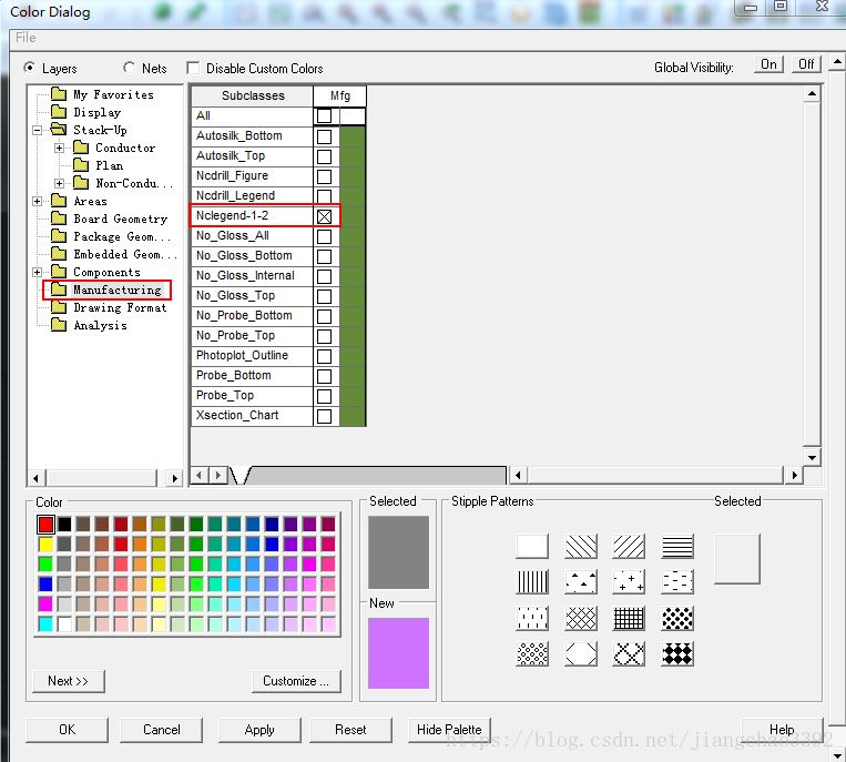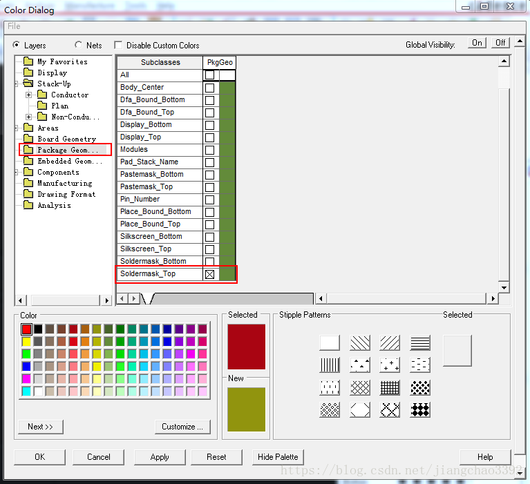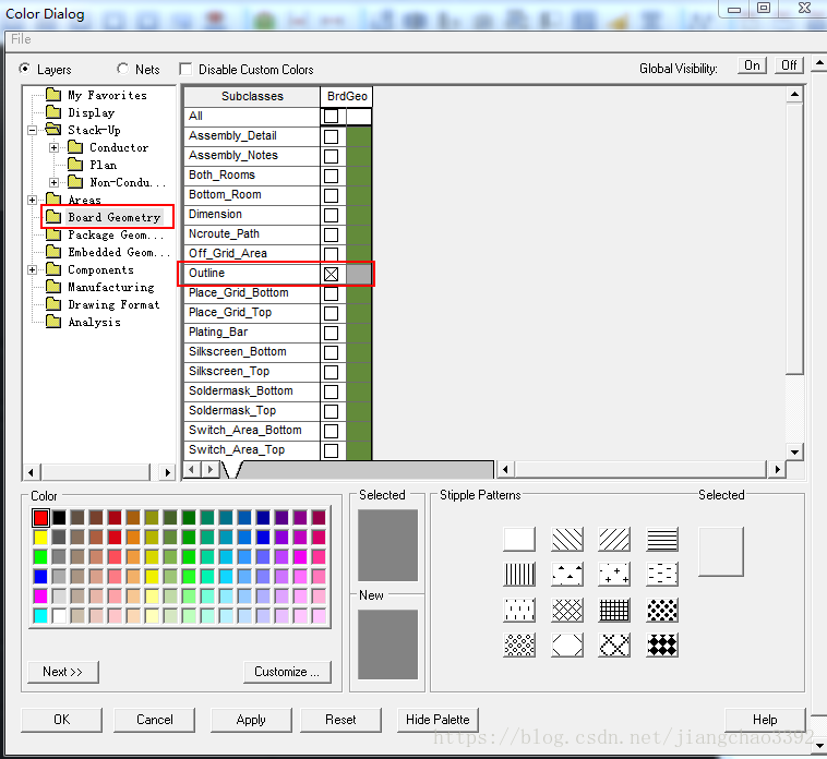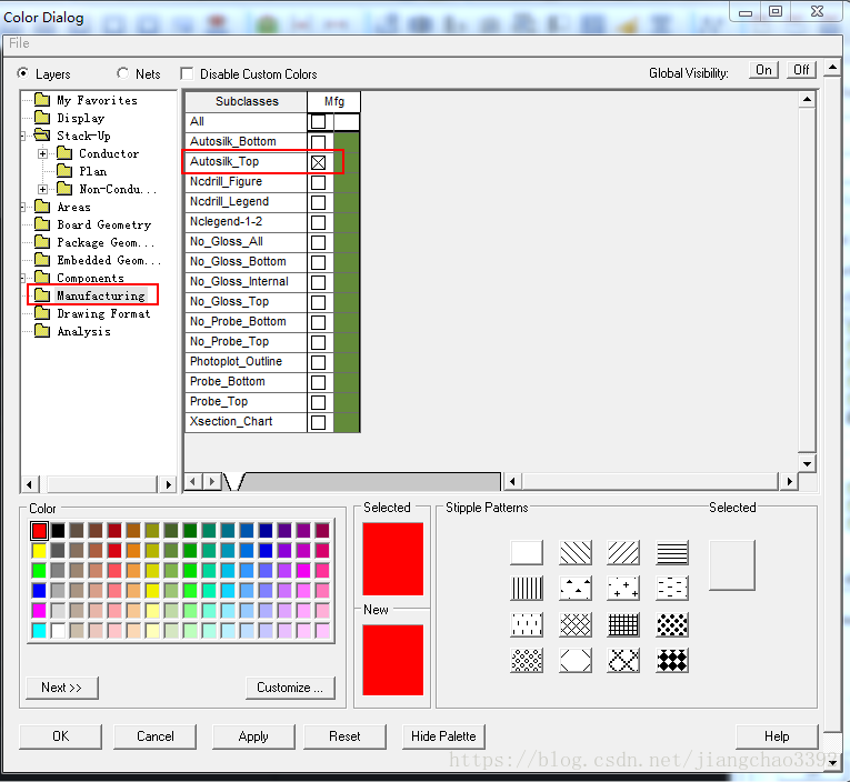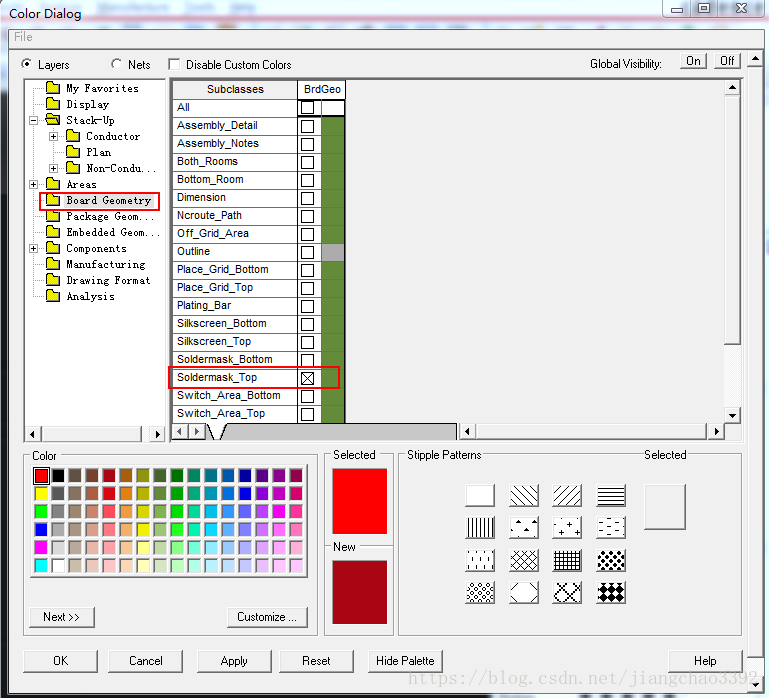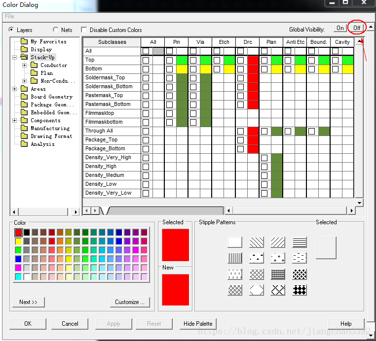保持ArtworkFilm Control窗口打开的状态,选择Display-Color/Visibility命令,然后点击Global Visibility Off关闭所有的显示